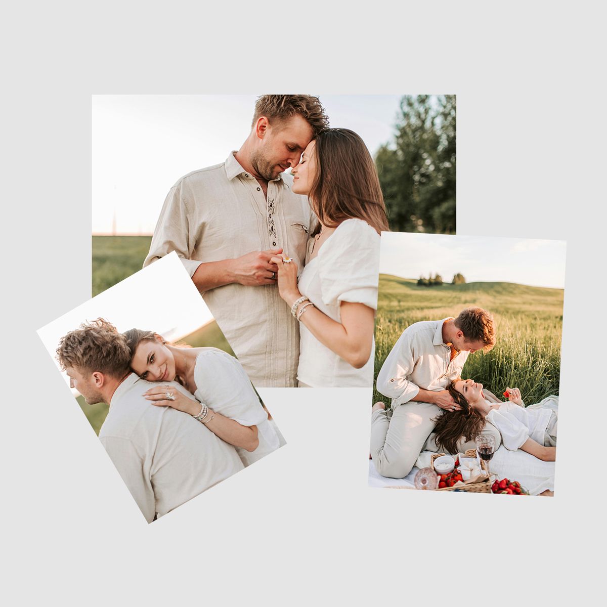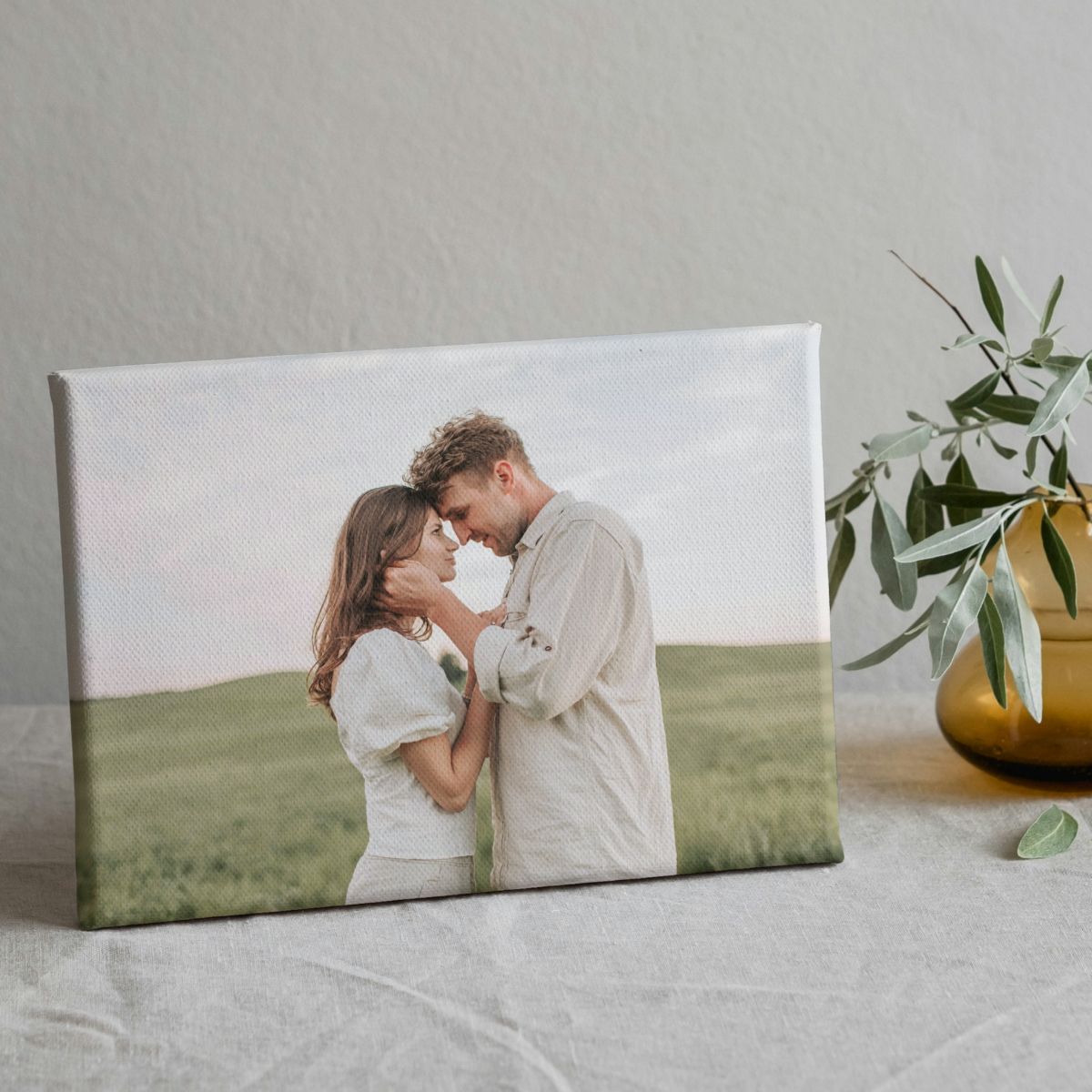 Custom collages featuring family portraits, wedding moments, or landscapes are printed on Premium Fine Art Canvas using Epson archival inks. The canvas is available in 1½" wrap depths with a semi-gloss laminate for protection against UV light and scratches. Canvases include sawtooth hangers for small sizes and wire hangers with craft paper backing for larger sizes.